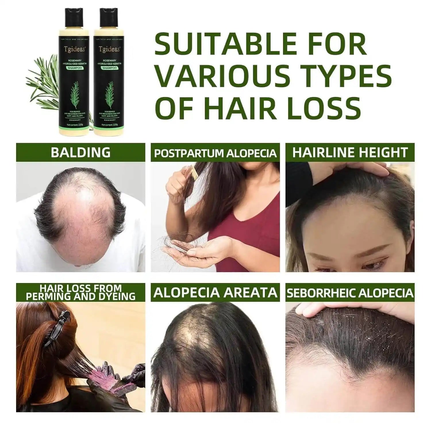 Experience visible new hair growth within just one week. The rosemary essence boosts scalp health and awakens dormant follicles, while hydrolyzed keratin repairs and protects each hair, leaving it shiny, smooth, and frizz-free—even for dry, damaged, or chemically treated hair. This shampoo fights multiple causes of hair loss: postpartum, aging, stress, and styling damage. Its gentle, silicone-free formula ensures the scalp stays light, clean, and balanced—keeping your hair hydrated and healthy all day.